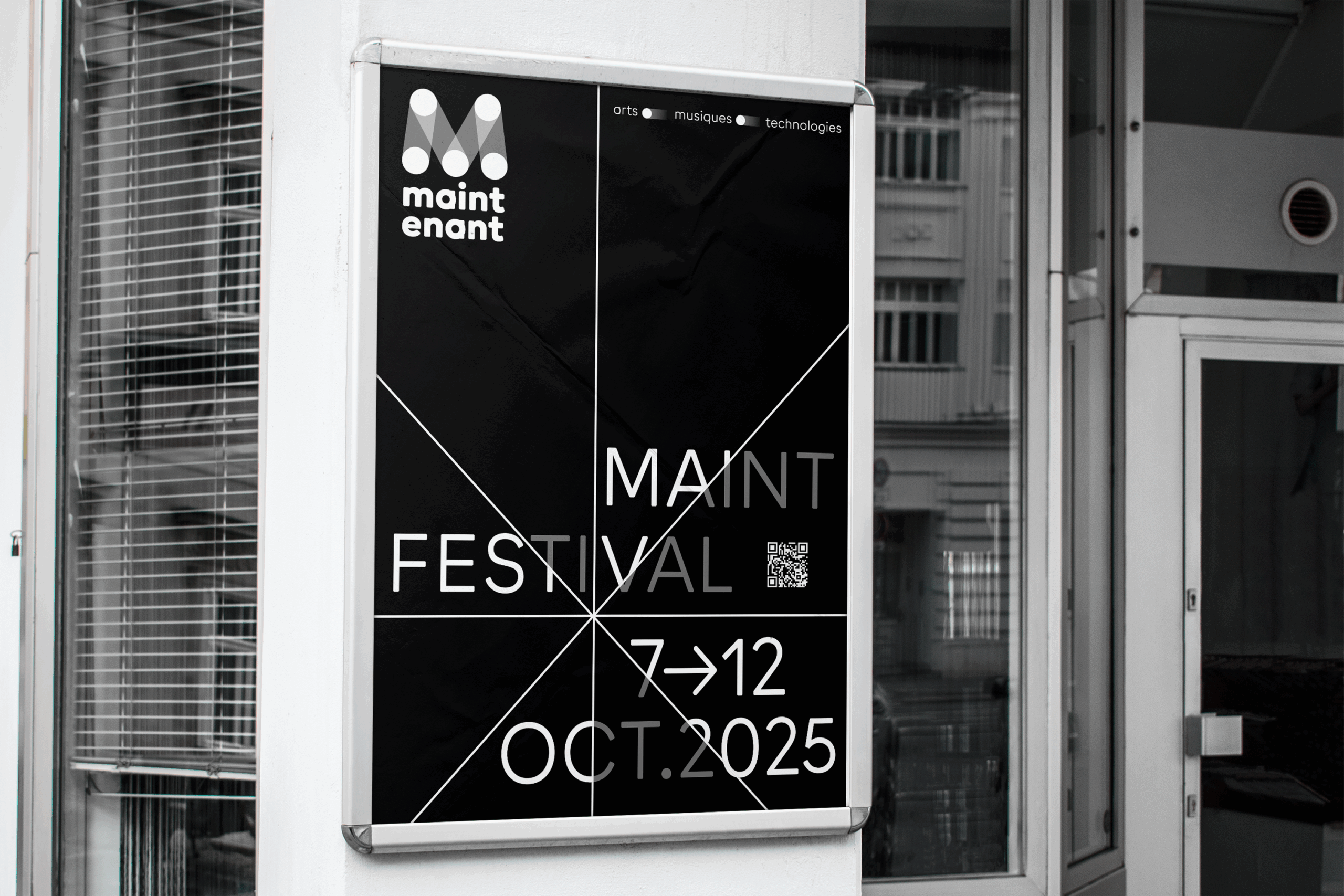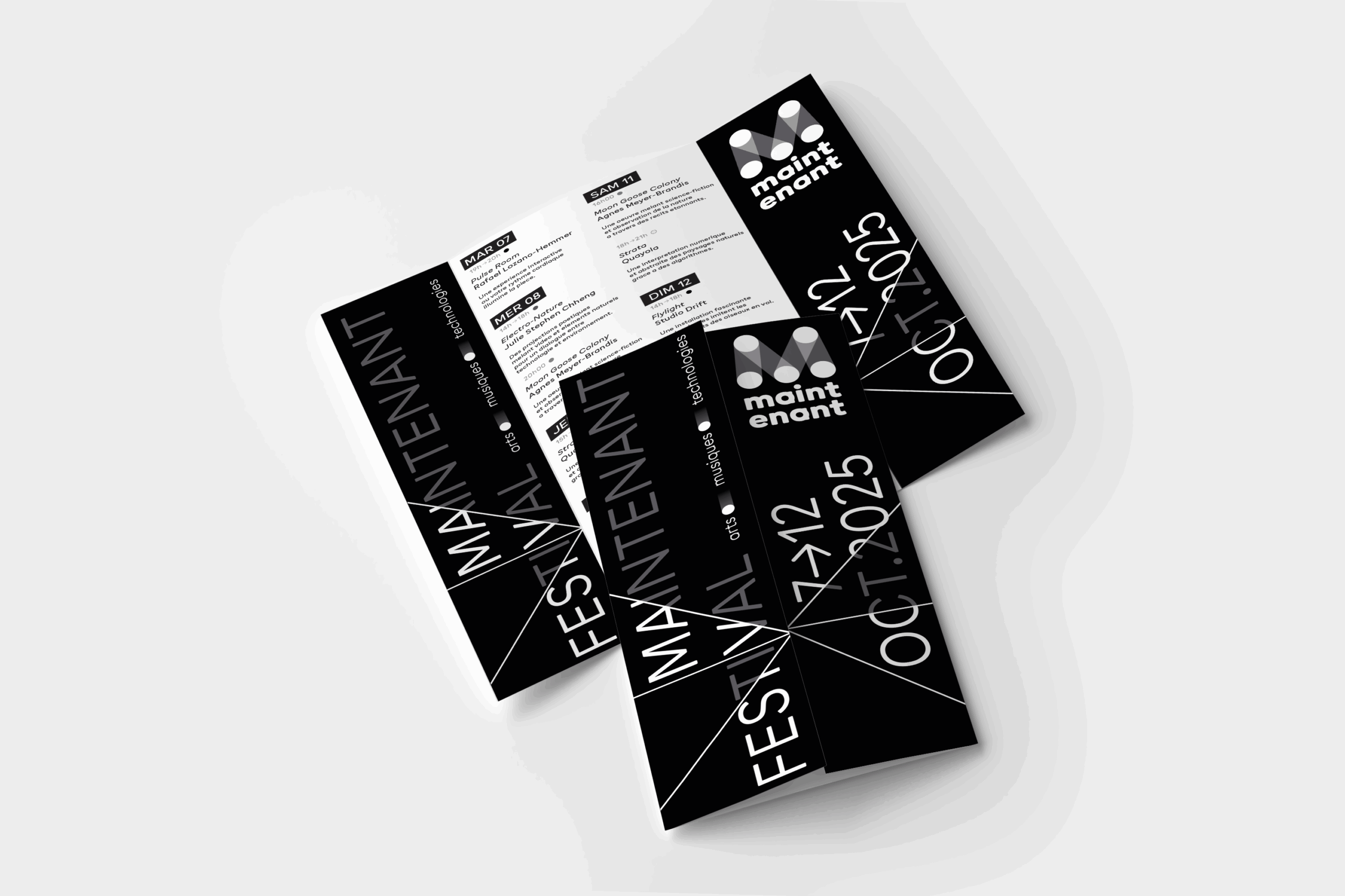 Conception d’un nouveau système graphique pour l’édition 2025 du Maintenant Festival, en s’appuyant sur son identité visuelle existante. L’objectif était de renouveler l’image du festival tout en respectant ses fondations graphiques et son ancrage dans les cultures numériques. Ce nouveau système, à la fois modulaire et reconnaissable, a été décliné sur l’ensemble des supports de communication : affiche, flyer et teaser vidéo.